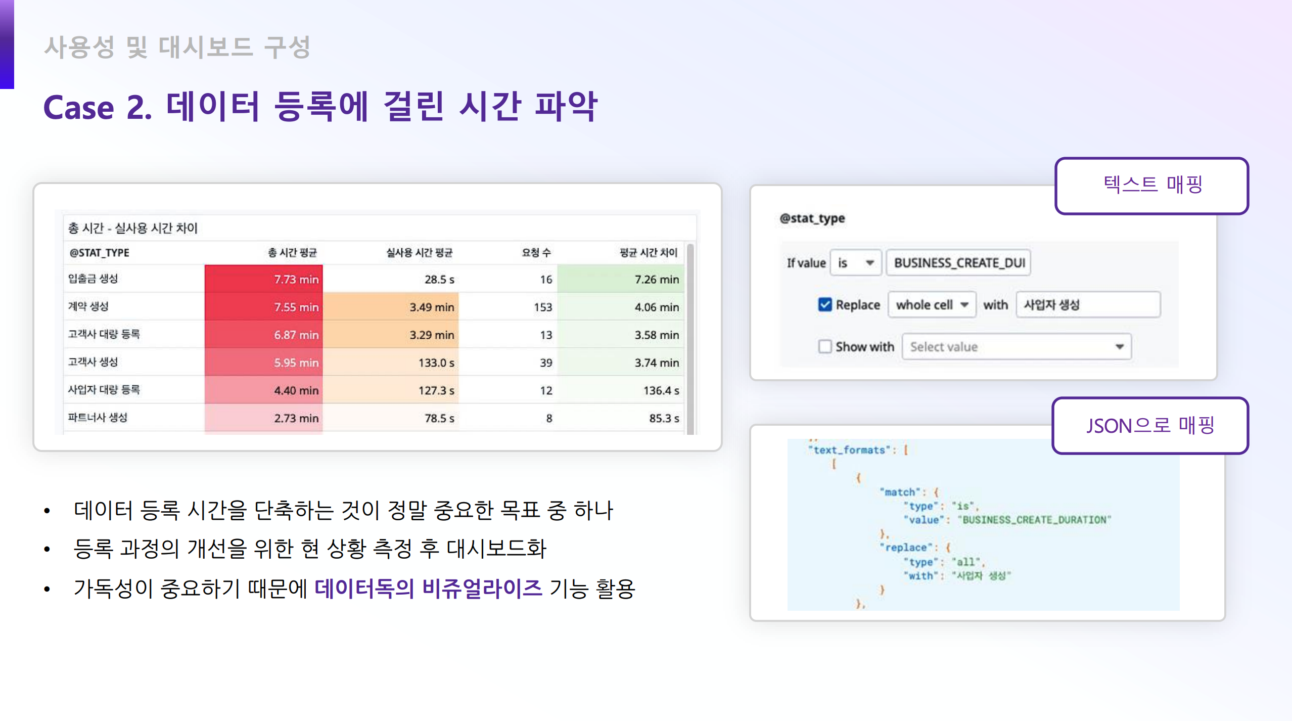 ๊ฒ์ ๊ธฐ๋ฅ: Custom Action์ ์ฌ์ฉํ์ฌ ๊ฒ์ ํํฐ ์์ญ์ ๋ ธ์ถ ๊ณ ์ ์ฌ๋ถ๋ฅผ ๊ฒฐ์ ํ๊ณ , Funnel ์ ํ์จ์ ํ์ธํ์ฌ ์ฌ์ฉ์ฑ์ ์ธก์ ํฉ๋๋ค. ๋ฐ์ดํฐ ๋ฑ๋ก ์๊ฐ ํ์ : ๋ฐ์ดํฐ ๋ฑ๋ก ์๊ฐ์ ๋จ์ถํ๋ ๊ฒ์ ๋ชฉํ๋ก, ๋ฑ๋ก ๊ณผ์ ์ ํ ์ํฉ์ ์ธก์ ํ๊ณ ๋์๋ณด๋ํํ์ฌ ๊ฐ์ ์ ์ ์ฐพ์ต๋๋ค. ์ปค์คํ ๋ฉํธ๋ฆญ์ผ๋ก ์ธ๋ฑ์ฑ: ์ฅ๊ธฐ์ ์ธ ์งํ ์ถ์ ์ ์ํด Custom Metric์ ์ฌ์ฉํฉ๋๋ค.
