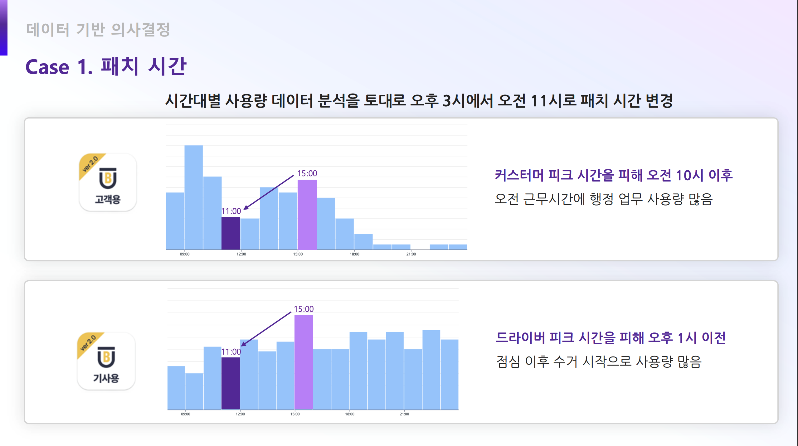 ํจ์น ์๊ฐ ๋ณ๊ฒฝ: ์๊ฐ๋๋ณ ์ฌ์ฉ๋ ๋ฐ์ดํฐ ๋ถ์์ ํตํด ๊ธฐ์กด ์คํ 3์์๋ ํจ์น ์๊ฐ์ ์ค์ 11์๋ก ๋ณ๊ฒฝํ์ต๋๋ค. OS ๋น์จ ํ์ธ: ๋๋ผ์ด๋ฒ์ iOS ์ฌ์ฉ ๋น์จ์ด ์ผ์ ์์ค ์ด์์ผ๋ก ์ฌ๋ผ๊ฐ๋ฉด iOS ์ฑ ์ ๊ณต์ ๊ณ ๋ คํ๊ณ , ๊ณ ๊ฐ์ ๊ฒฝ์ฐ Windows ์ฌ์ฉ ๋น์จ์ด ์๋์ ์ด๋ฏ๋ก ์น ์คํ์ผ ์ง์์ด ํ์ํจ์ ํ์ธํ์ต๋๋ค.